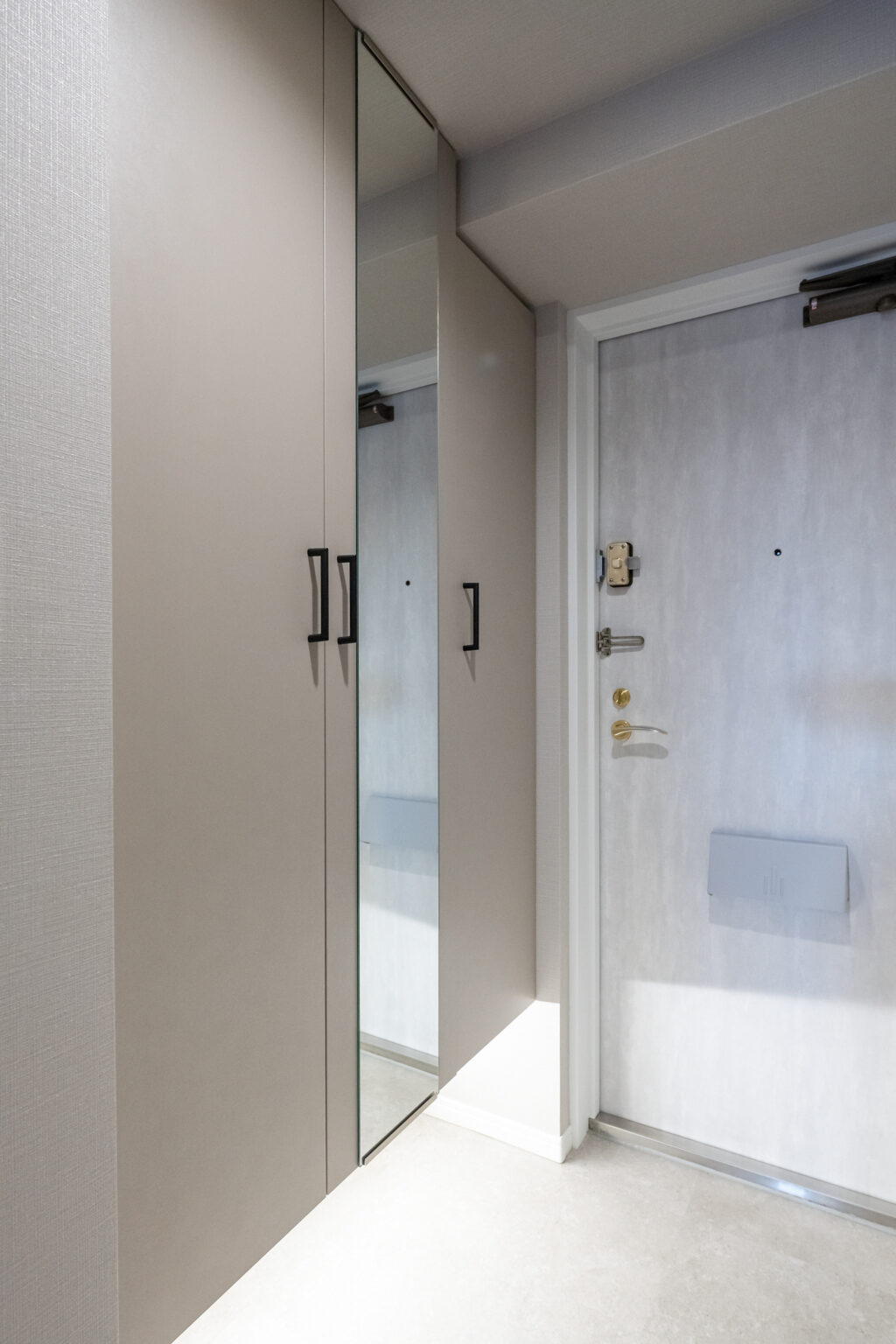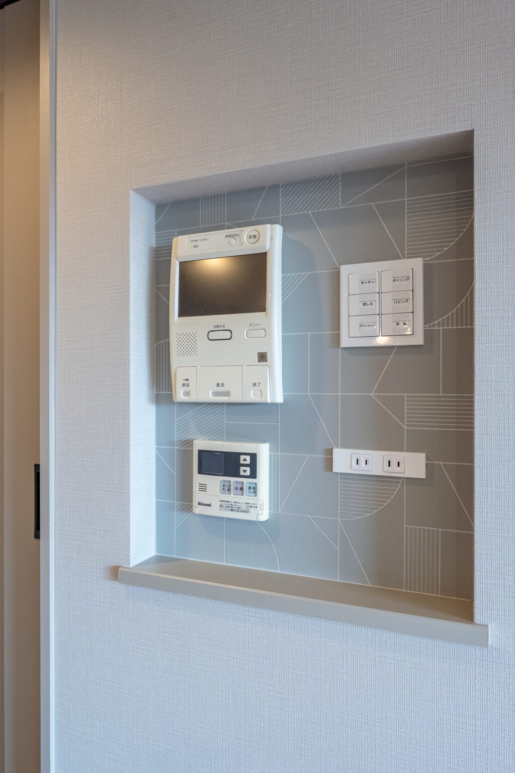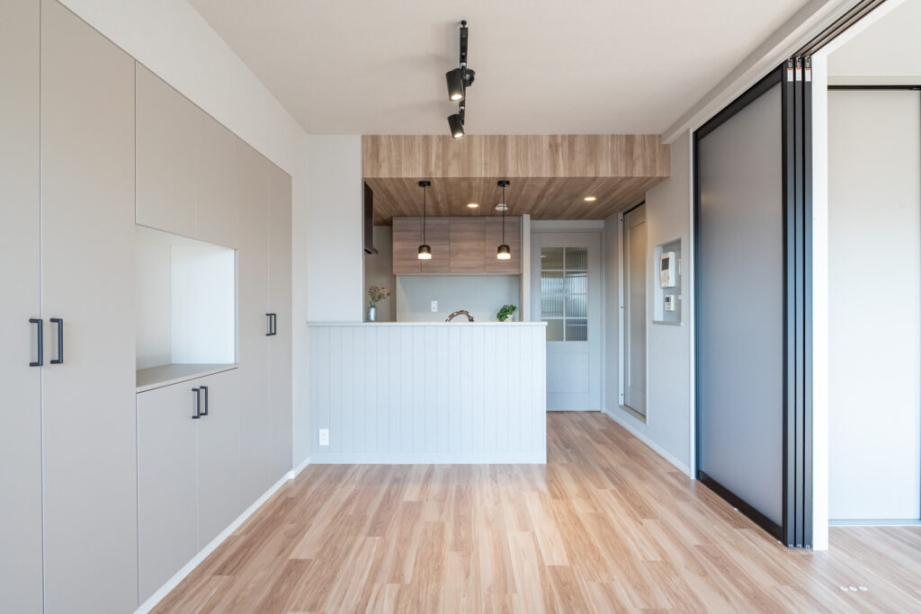 さらに洋室には壁掛けテレビ用の造作壁を設け、リビングには壁面収納を新設。