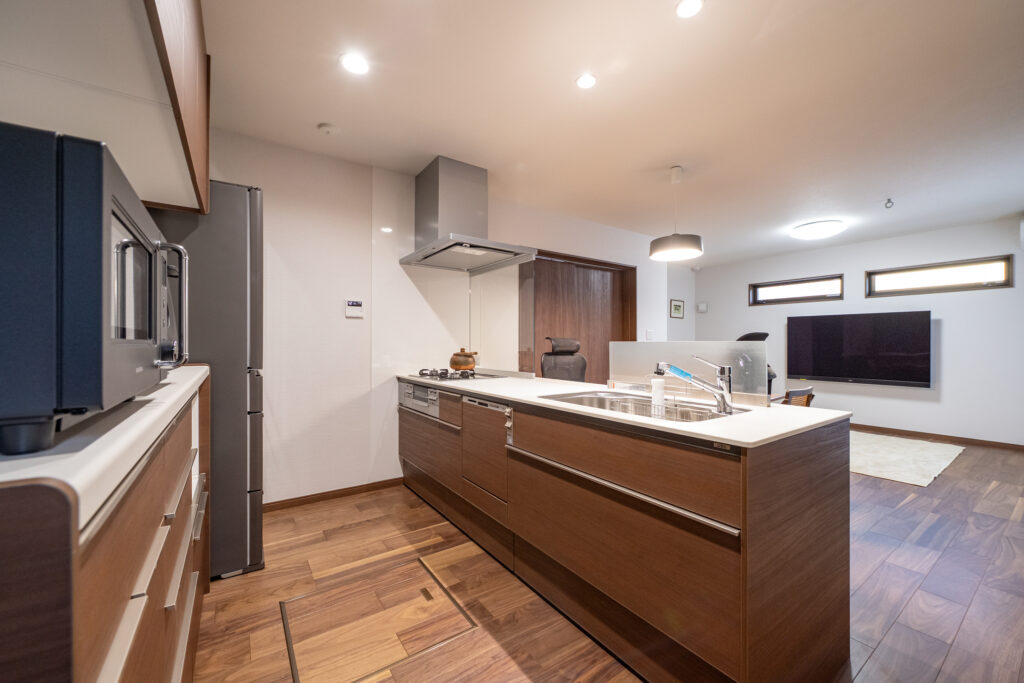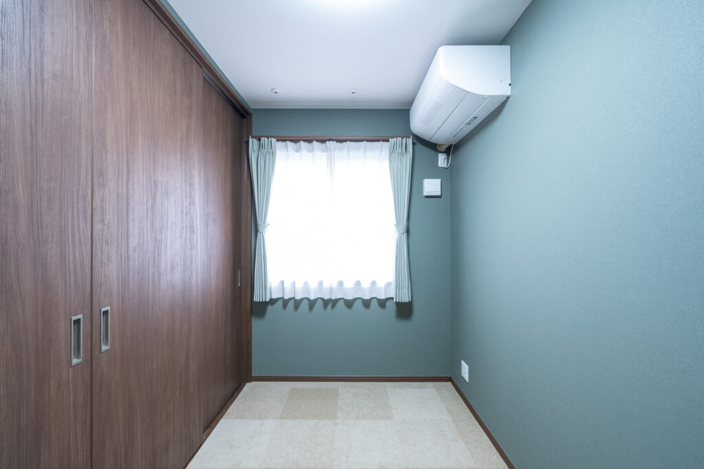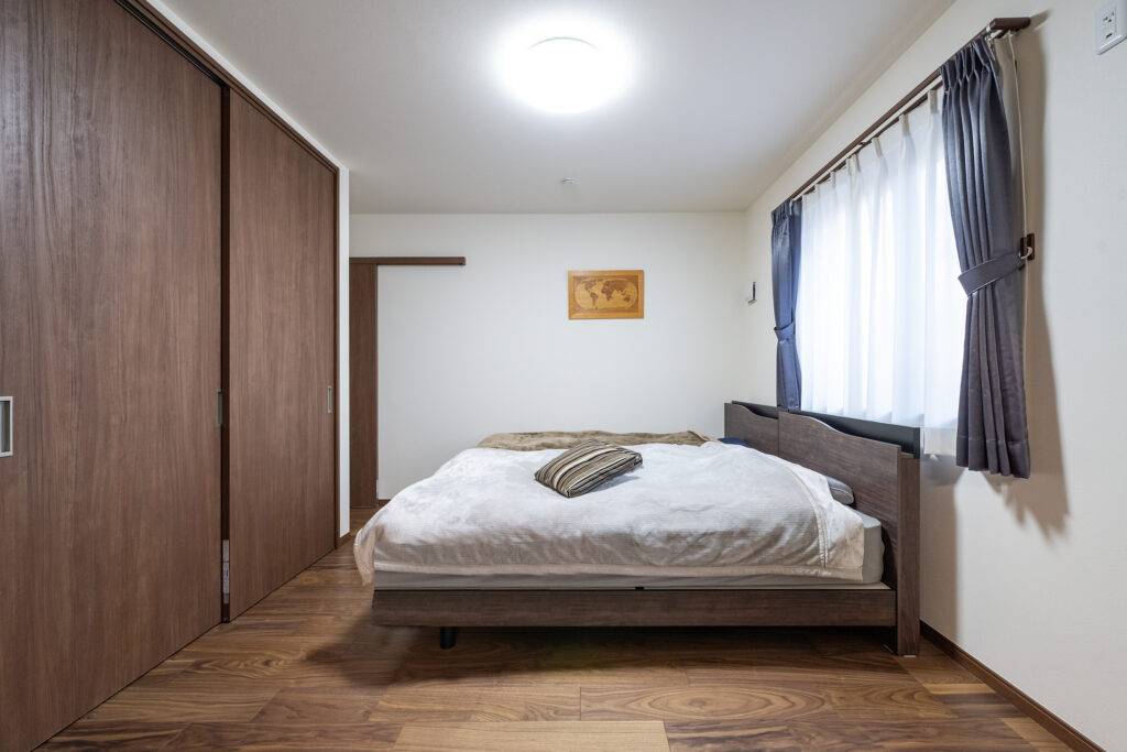 水回り設備はお掃除のしやすさや汚れの目立ちにくさに配慮した設備へ一新し、全体をブラウンで統一することで、落ち着きと温もりを感じるデザインに仕上げました。さらに、来客が滞在できるゲストルームも新設し、グリーンの壁紙とカーテンで他の部屋とは異なる特別感のある空間を演出しています。
